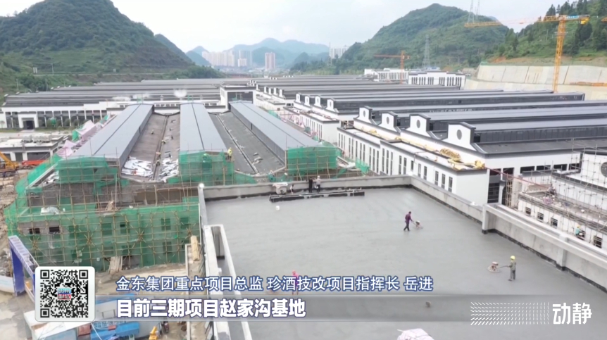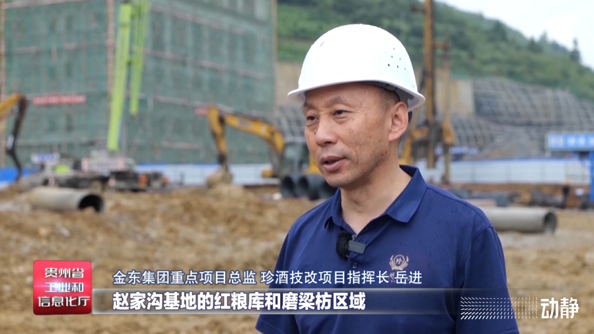 金东集团重点项目总监、珍酒技改项目指挥长岳进说,他们所在的场地是珍酒三期赵家沟基地的红粮库和磨梁枋基地,目前,磨梁枋主体全面已经封顶了,室内正在抓紧进行设备的安装,在今年的重阳节前所有设备将安装完成,进入新周期的投产的磨粮生产,现在看到在装机建设的是红粮库,采用的是装配式的建筑,施工工艺比较先进,进度会比较快,也将在今年的10月份全面建成。