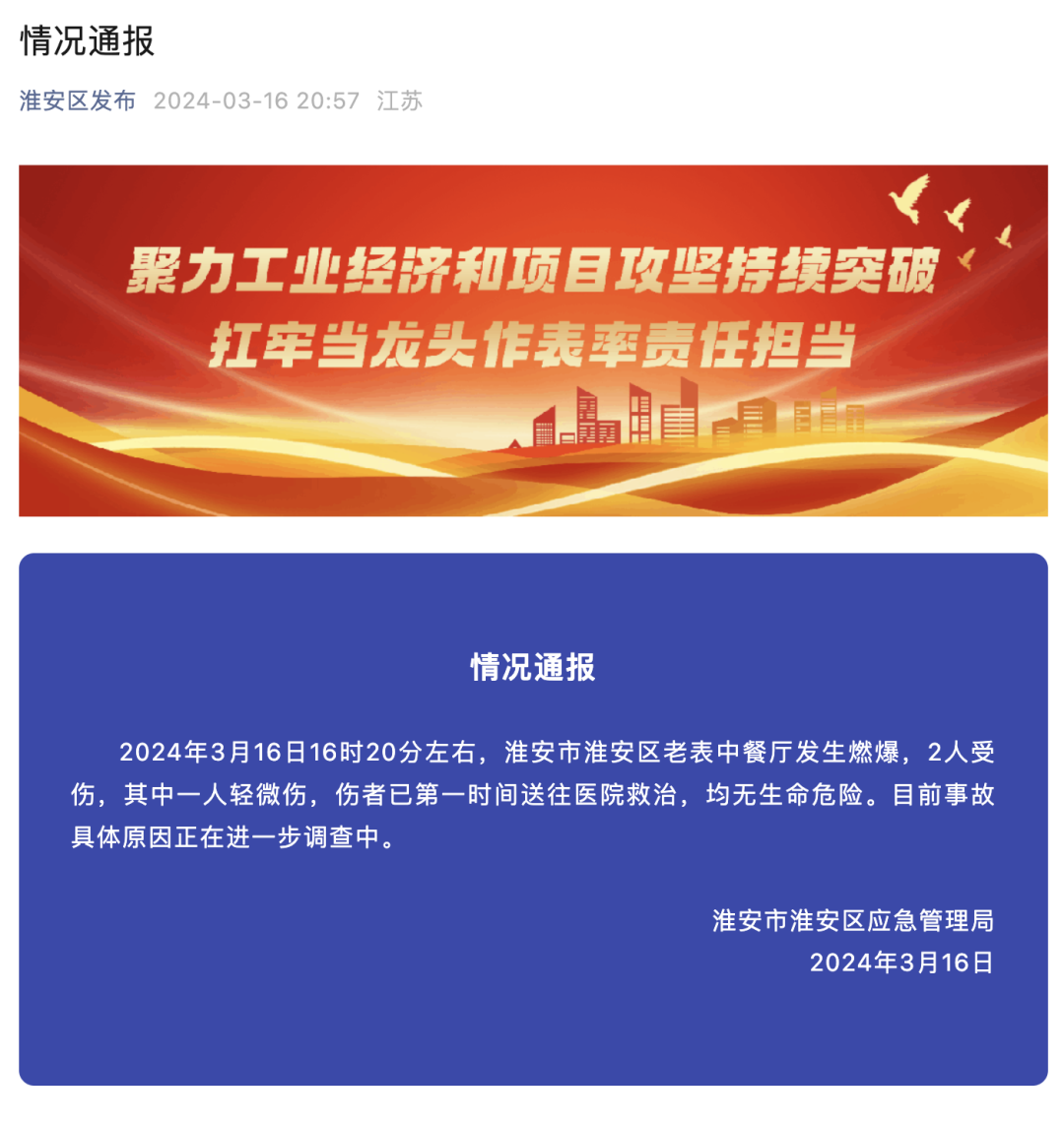 淮安区发布微信公号16日晚通报:2024年3月16日16时20分左右,淮安市淮安区老表中餐厅发生燃爆,2人受伤,其中一人轻微伤,伤者已第一时间送往医院救治,均无生命危险。目前事故具体原因正在进一步调查中。