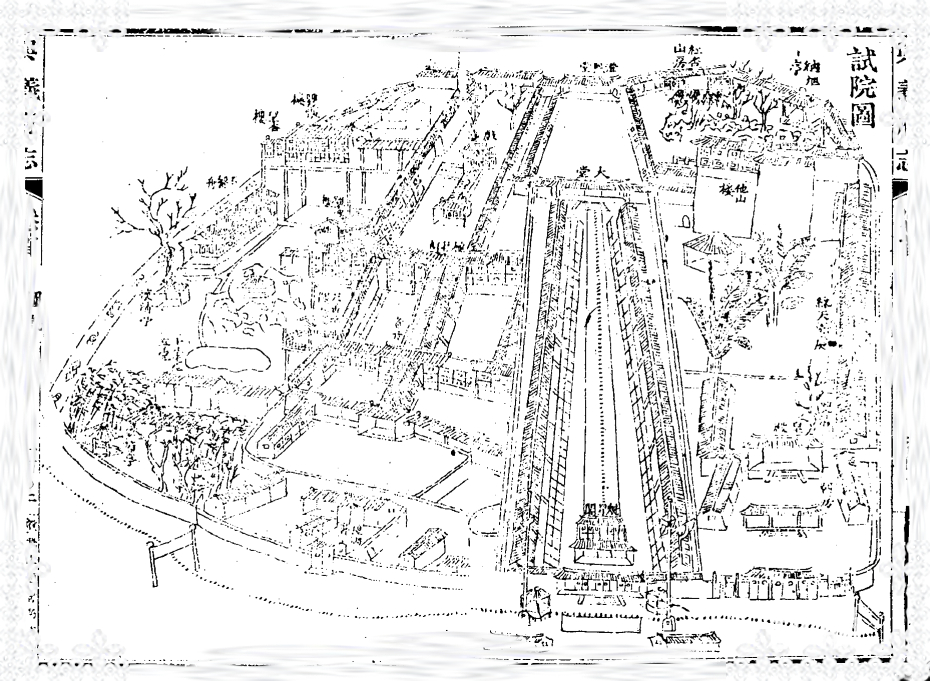 戏台西侧,有廊径通试院二堂,悬有匾额,题“旁求俊乂”,就是广纳贤才。台后有亭,匾题:“木樨香里”,同样是形容桂花芳香。有联云:“小试栽培,桂欲凌云香满月;大文绚烂,杏看映日艳蒸霞。”故此亭也可称“桂亭”。亭侧有穿堂,面阔三间,额题“意舟”,寓心怀大志。后为书室,面阔五间,额题“芝兰室”,助人从善之意。其下为面阔十七间的回楼,作为学舍使用。整个试院东区还包括骋怀楼、观海楼和天香阁。骋怀就是游目骋怀,心旷神怡。观海就是可远观招堤之绿海。天香即指桂花香。三楼为试院最高,张锳形容描述,“凭栏一望,城中万家灯火,尽在目前。雉堞以外,近则蔬圃菜园,远则谷塍稻陇。又远则青山绿海,古寺丛林。五里长堤,架虹腰于山畔,十寻碧塔,翻倒影于水湄,洵为边域雅观。”