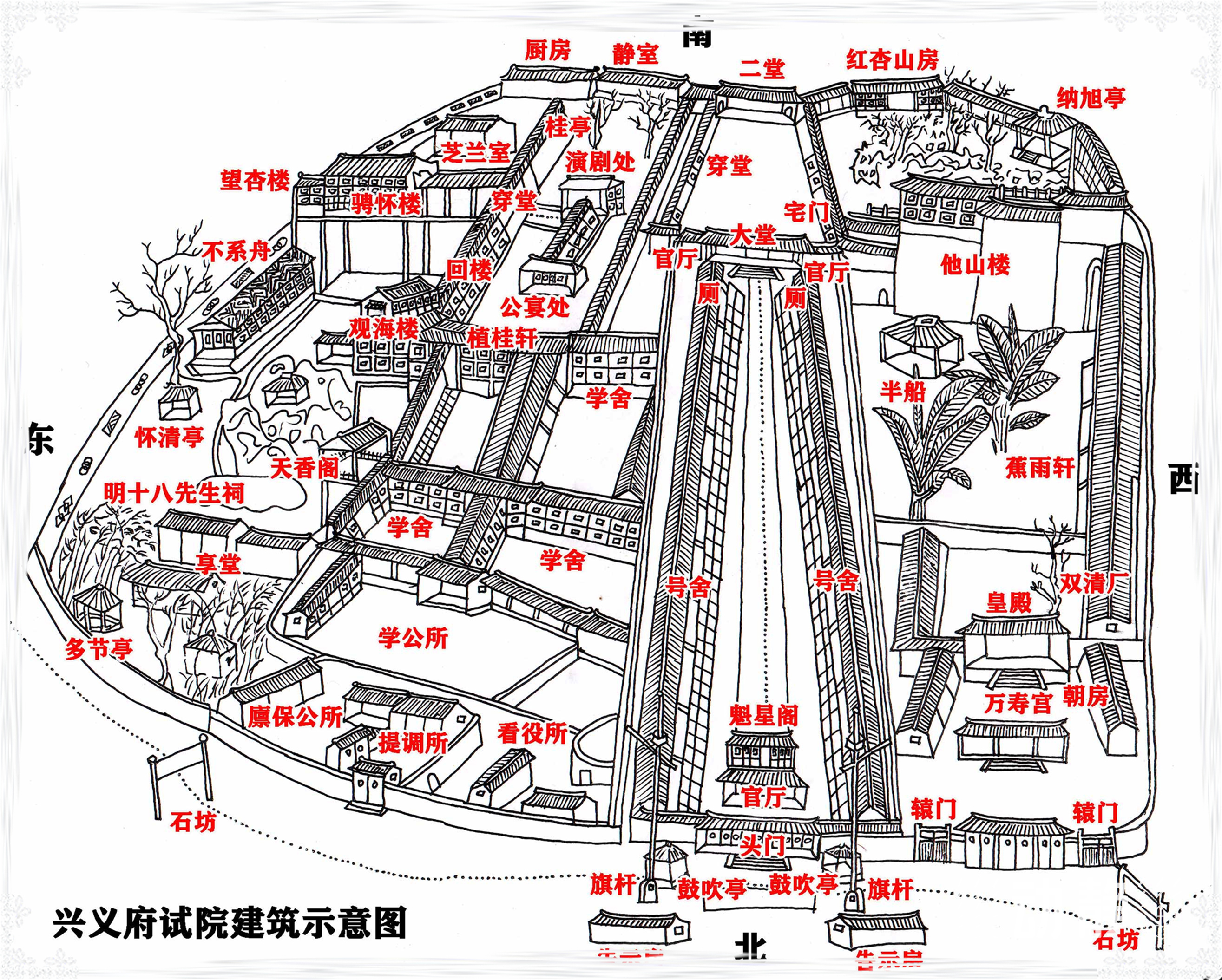 从二堂“折而向西”,为试院西区最南端。“树石幽秀,有红杏、林檎(花红)、芭蕉之属”,正屋面阔三间,故称“红杏山房”,乡贤陈晋衍题联,云:“衣榻听残蕉叶雨;春窗开出杏花天。”通过“曲廊而前”,有一亭,曰“纳旭亭”,广西平乐举人袁理题联,云:“点缀须参摩诘画;依稀如上子云亭。”摩诘指唐代王维,子云指汉代杨雄,都是诗画文学大家。亭子位于试院西南端,故名“纳旭”,即接纳太阳之余辉。沿廊继续往北,为“他山楼”。此楼面阔三间,高大宏阔,为曾任贵山书院山长的安龙李琼英(字花影,号他山)祖屋,张锳以其旧交,为纪念而修复。镌有两联,一云:“囘首目应窥上界;无心身已到层楼。”二云:“非近水源曾得月;为徒壁立好看山。”这个“山”,既指院后桅杆山,也暗指李他山。沿楼往北,还有面阔七间的“蕉雨轩”,静室“双清厂”,以及“半船”。“蕉雨轩”因庭院内“皆种绿蕉”得名,原始图纸上还有“绿天深处”四字,猜测可能是匾额题字。“双清厂”指思想及行事清新脱俗。“半船”即“半舫”,意思是建在庭院水池旁的建筑。