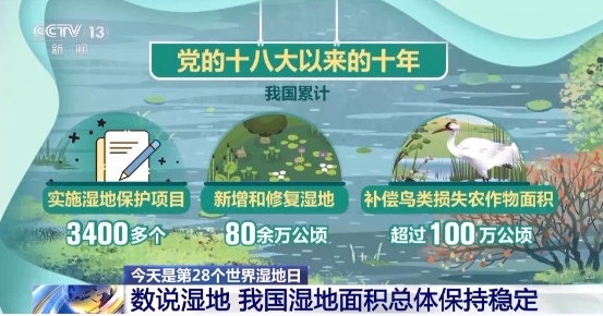 党的十八大以来的十年,我国累计实施湿地保护项目3400多个,新增和修复湿地80余万公顷,补偿鸟类损失农作物面积超过100万公顷。