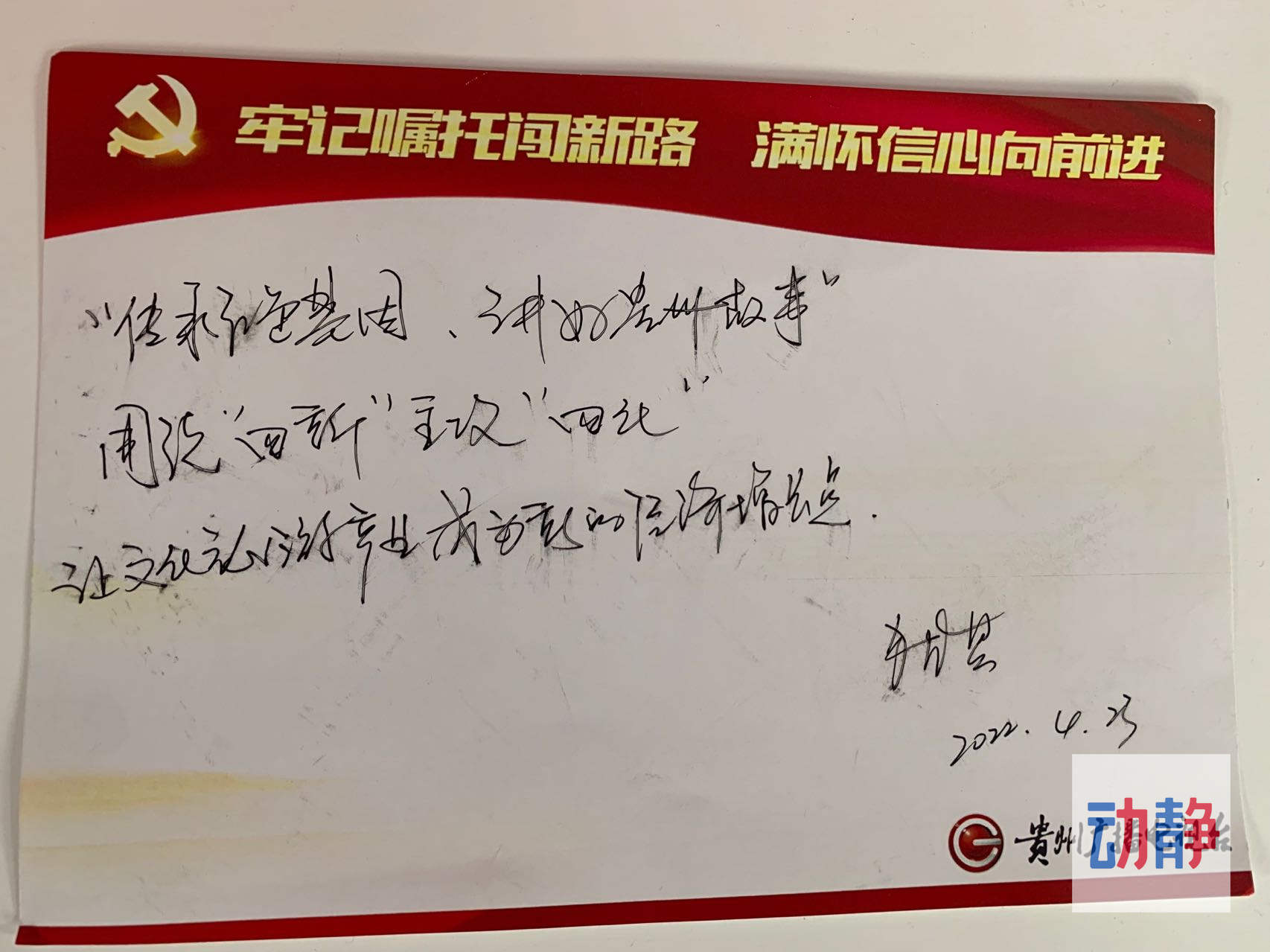 省第十三次党代会代表、遵义市红花岗区文化馆馆长犹芸写下的话是:传承红色基因,讲好贵州故事。围绕“四新”主攻“四化”。让文化旅游产业成为新的经济增长点。