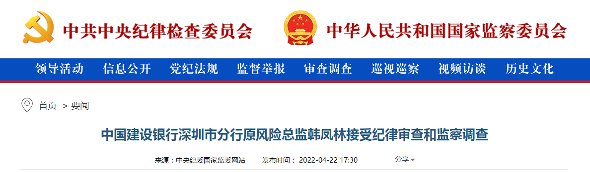 据中央纪委国家监委驻中国建设银行纪检监察组、山东省纪委监委消息:中国建设银行深圳市分行原风险总监韩凤林涉嫌严重违纪违法,目前正接受中央纪委国家监委驻中国建设银行纪检监察组纪律审查和山东省青岛市监察委员会监察调查。