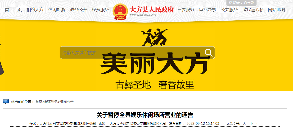 当前,疫情防控形势异常严峻,为有效控制和降低疫情传播风险,保障全县人民群众生命安全和身体健康,决定自2022年9月12日18时起,暂停全县KTV、酒吧、网吧、游戏厅、电影院、台球室、室内游泳馆、健身房、室内儿童游乐场、洗浴中心、棋牌娱乐室、休闲吧等娱乐休闲场所的营业,恢复营业时间根据疫情防控形势另行通知。