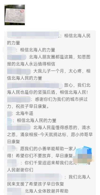 记者注意到,筹款页面显示,共有1万多人参与捐款,有8.7万次转发。有网友留言:“放心,我们北海人民也是你的坚强后盾”“希望孩子早日康复”……