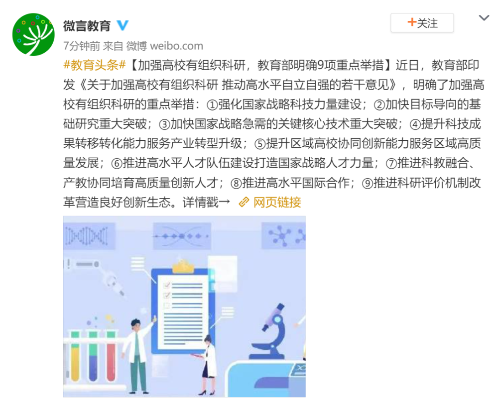近日,教育部印发《关于加强高校有组织科研 推动高水平自立自强的若干意见》,明确了加强高校有组织科研的重点举措:①强化国家战略科技力量建设;②加快目标导向的基础研究重大突破;③加快国家战略急需的关键核心技术重大突破;④提升科技成果转移转化能力服务产业转型升级;⑤提升区域高校协同创新能力服务区域高质量发展;⑥推进高水平人才队伍建设打造国家战略人才力量;⑦推进科教融合、产教协同培育高质量创新人才;⑧推进高水平国际合作;⑨推进科研评价机制改革营造良好创新生态。