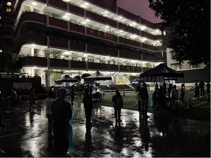晚上灯火初上,贵阳的夜空飘洒着密密的小雨,一盏盏灯光,照亮了雨中的达德学校。凉风习习,雨水袭面,登记、扫码、引导······志愿者教师们还在坚持着,大家始终在意与关心的只有手中的工作和做核酸检测的每位市民。