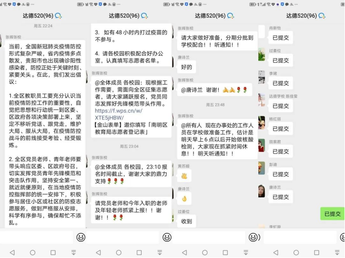 2022年9月2日,疫情防空号角吹响。当天深夜,达德小学党支部书记、校长张晖迅速响应号召做出指示,学校全体教职工积极响应,闻令而动,纷纷主动请缨以最快速的时间组建了一支“志愿抗疫团队”,他们把新时代教师队伍的责任与担当,书写在疫情防控的最前线。