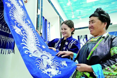 近年来,贵州省黔东南苗族侗族自治州榕江县积极培训非遗传承人,并为掌握非遗技艺的传承人提供创作、创业平台,实现在家门口创业就业增收。同时,让非遗传承人积极参与乡村治理和建设,文明新风扑面而来。图为近日,榕江县摆贝苗寨非遗传承人姜老本(右)在查看蜡染制品。