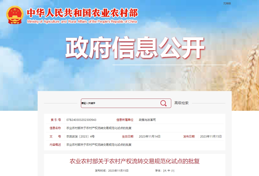 近日,农业农村部官网发布《农业农村部关于农村产权流转交易规范化试点的批复》,批复北京市等13个农村产权流转交易规范化整省(自治区、直辖市)试点,石家庄市等33个农村产权流转交易规范化整市(州)试点,新河县等35个农村产权流转交易规范化整县(市、区)试点。(见附件)