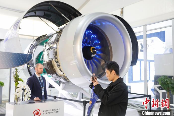 参观者手机拍摄联合发动机集团公司(UEC)自主研发的大涵道比涡扇发动机PD-14。中新网记者 殷立勤 摄