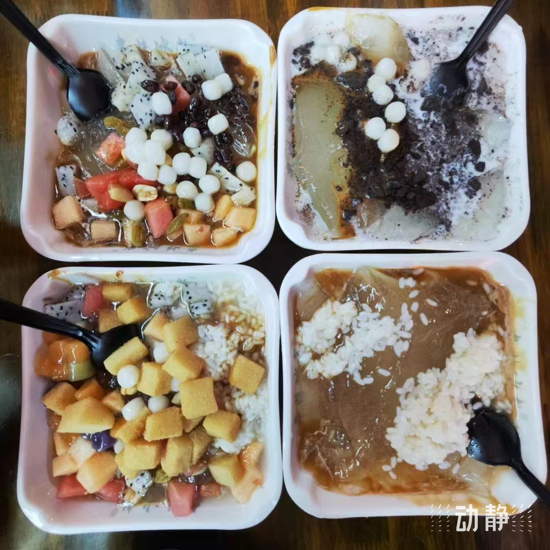 而且,粉妆玉琢的冰粉,跟暗红色的糖水混合后,好像也更养眼些。有人说,还没开始吃,就联想起李白的名句“玉碗盛来琥珀光”。
