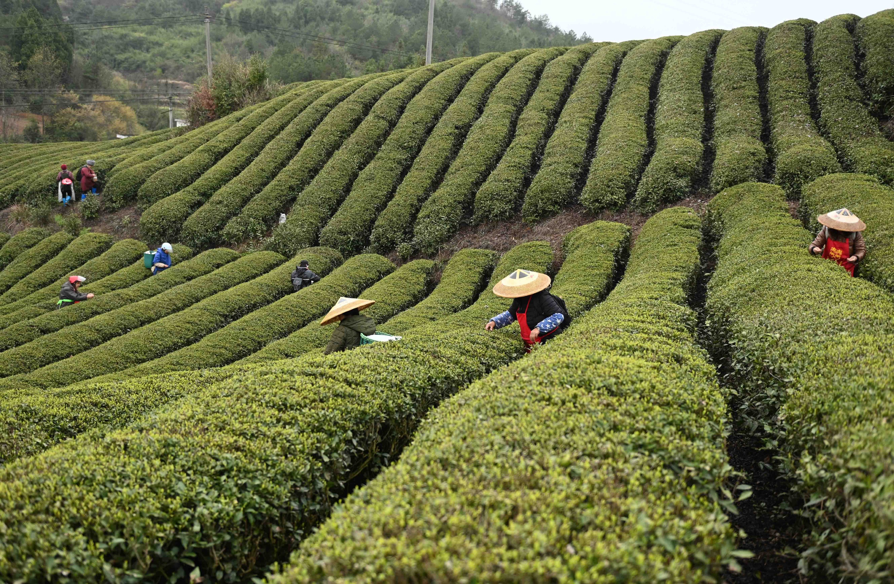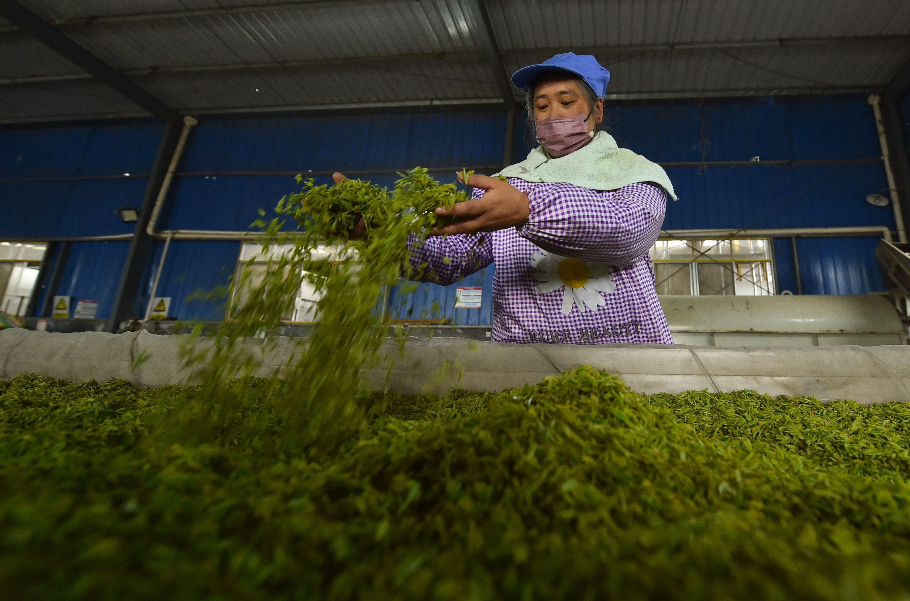 村民们将新采的茶青交付给企业后,即可凭着票据领取现金。茶叶加工厂飘散出浓郁的茶香,村民们在生产线上忙碌着。新茶在经过摊青、理条、炒干等工序后,被加工成翠芽茶和毛峰茶。