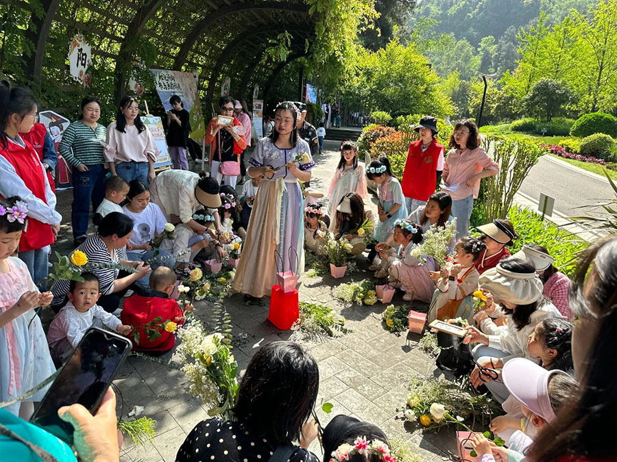 当天下午,随着一群身着汉服的小读者们唱起童谣《迎花朝》,花朝节国潮故事会活动开始了。大家认真地听着老师讲述中国传统故事《花神女夷》,并在赏花护红、古法花朝纸、亲子合作完成插花作品等活动环节,亲身感受了很多新奇体验……在欢乐的活动中,孩子们体验了一个丰富多彩的传统中国节。