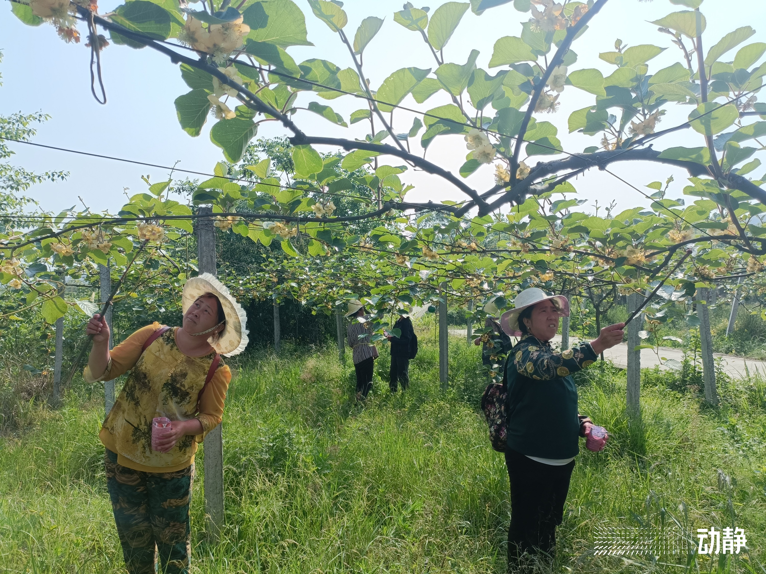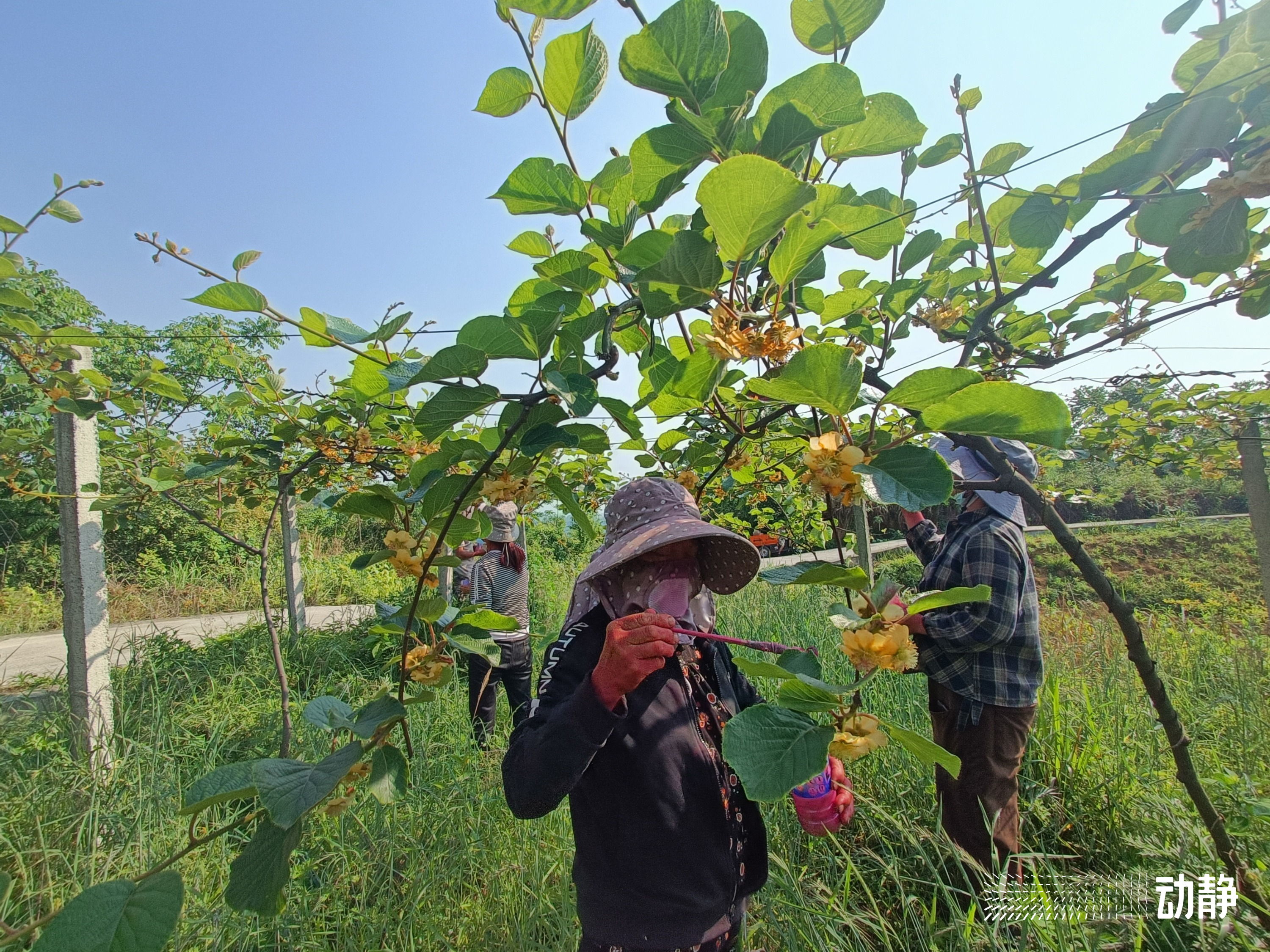 由于猕猴桃是雌雄异株花果树,单靠天然的风媒授粉、虫媒传粉挂果率低,利用人工辅助授粉,能保证挂果率和果品质量,近一段时间,基地每天都有几十名工人给猕猴桃授粉。